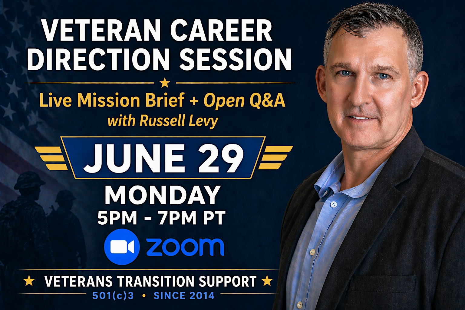 Join Russell Levy, JD, Founder & President of Veterans Transition Support (VTS), for a focused live briefing designed to help veterans and military families successfully navigate the transition from military service to civilian careers.